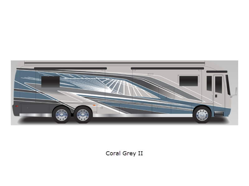 Sleeps 5 Slides 4 Length 44 ft 11 in Ext Width 8 ft 5 in Ext Height 12 ft 8 in Int Height 7 ft Interior Color Chiffon, Pashmina, Truffle Exterior Color Arctic Blue II, Black Cherry, Cobalt Blue II, Coral Grey II, Crimson Snow II, Golden Harvest II, Night Rider, Steel Grey II Hitch Weight 15000 lbs GVWR 52000 lbs Fresh Water Capacity 100 gals Grey Water Capacity 62 gals Black Water Capacity 41 gals Tire Size 22.5" Furnace BTU 65600 btu Generator Onan 10,000W Diesel Fuel Type Diesel Engine Cummins L9 Turbocharged Chassis Spartan K2 Raised Rail Horsepower 450 hp Fuel Capacity 150 gals Wheelbase 320 in Available Beds King Torque 1250 ft-lb Refrigerator Type Stainless Steel Residential Convection Cooking Yes Cooktop Burners 2 Shower Size 36" x 46" Number of Awnings 2 Axle Weight Front 20000 lbs Axle Weight Rear 20000 lbs Axle Weight Tag 12000 lbs Water Heater Type Aqua Hot 450 Diesel Hydronic AC BTU 45000 btu TV Info Samsung QLED 4K UHD Smart TV; Overhead 32", LR 50", BR 43", Ext. 43" Awning Info Roof-Mounted Girard Vision Dual Pitch with LED Lights Washer/Dryer Available Yes Gross Combined Weight 67000 lbs Shower Type Standard Electrical Service 50 amp Similar Floorplans