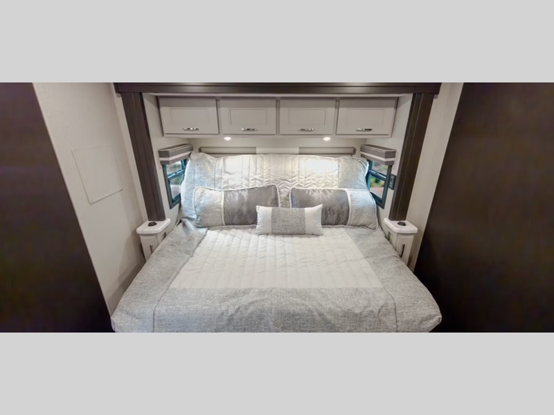 Sleeps 5 Slides 2 Length 35 ft 6 in Ext Width 8 ft 5 in Ext Height 13 ft 3 in Int Height 7 ft Interior Color Outlander 2, North Island 2 Exterior Color Full Body Paint; Beacon Blue, Lenox Ash II, Phantom Falls II Hitch Weight 15000 lbs GVWR 32700 lbs Fresh Water Capacity 100 gals Grey Water Capacity 40 gals Black Water Capacity 40 gals Tire Size 295/75R 22.5" Furnace BTU 35000 btu Generator Onan RV QD 8000 Diesel Fuel Type Diesel Engine Cummins B6.7L Chassis Freightliner S2RV Horsepower 360 hp Fuel Capacity 100 gals Wheelbase 246 in Number Of Bunks 1 Available Beds Tilt-A-View Inclining King Torque 800 ft-lb Refrigerator Type Residential Convection Cooking Yes Cooktop Burners 2 Shower Size 30" x 36" Number of Awnings 1 LP Tank Capacity 105 lbs Water Heater Type Tankless AC BTU 30000 btu Basement Storage 132 cu. ft. TV Info LR 42" LED Smart TV, BR 32" LED Smart TV, Ext. 40" LED TV Awning Info 16' Patio Power w/Integrated LED Lighting Washer/Dryer Available Yes Gross Combined Weight 46000 lbs Shower Type Standard Electrical Service 50 amp Similar Floorplans