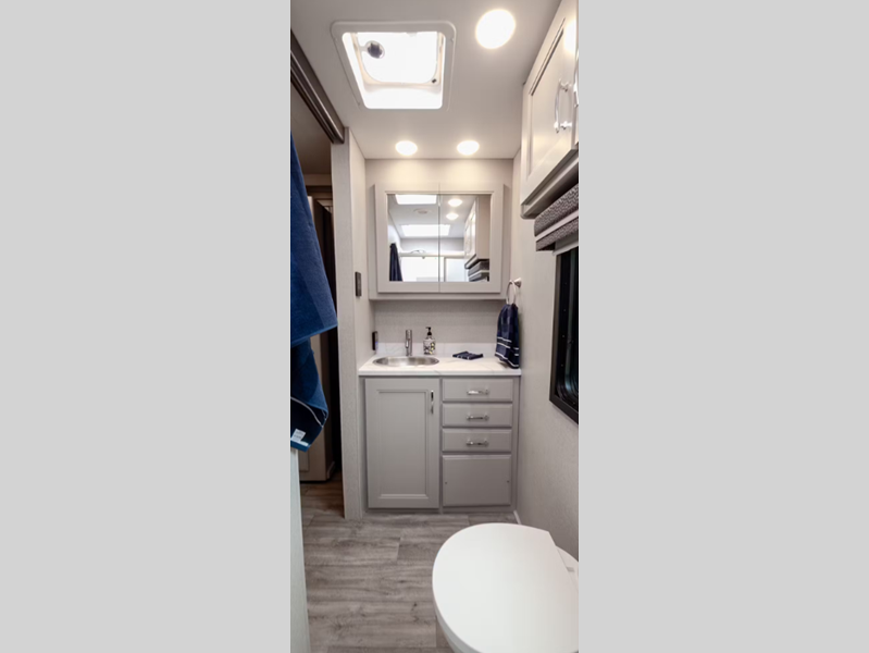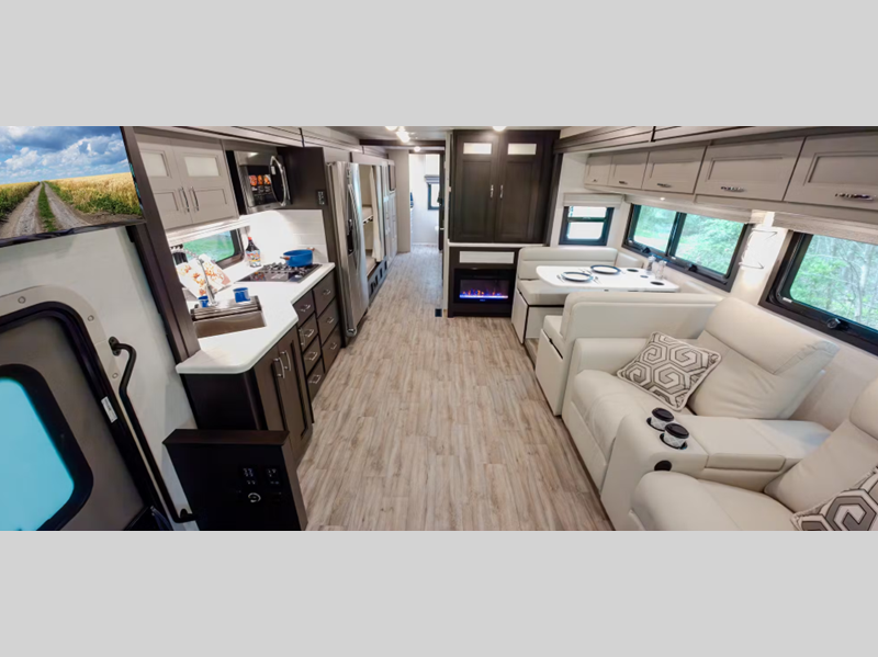 Each includes the Freightliner custom chassis' S2RV with an Atlas foundation, a Cummins ISB-XT engine for power, and a 15,000 lb. trailer hitch to tow your commuter vehicle. The air ride adjustable cockpit seats provide customizable settings for both the driver and passenger, and the back-up monitor plus side view camera system makes each coach easy to maneuver. Inside you will find theater seating to relax in while enjoying your favorite beverage, residential linoleum throughout that is easy to keep clean, and designer backsplash for an added touch of luxury.